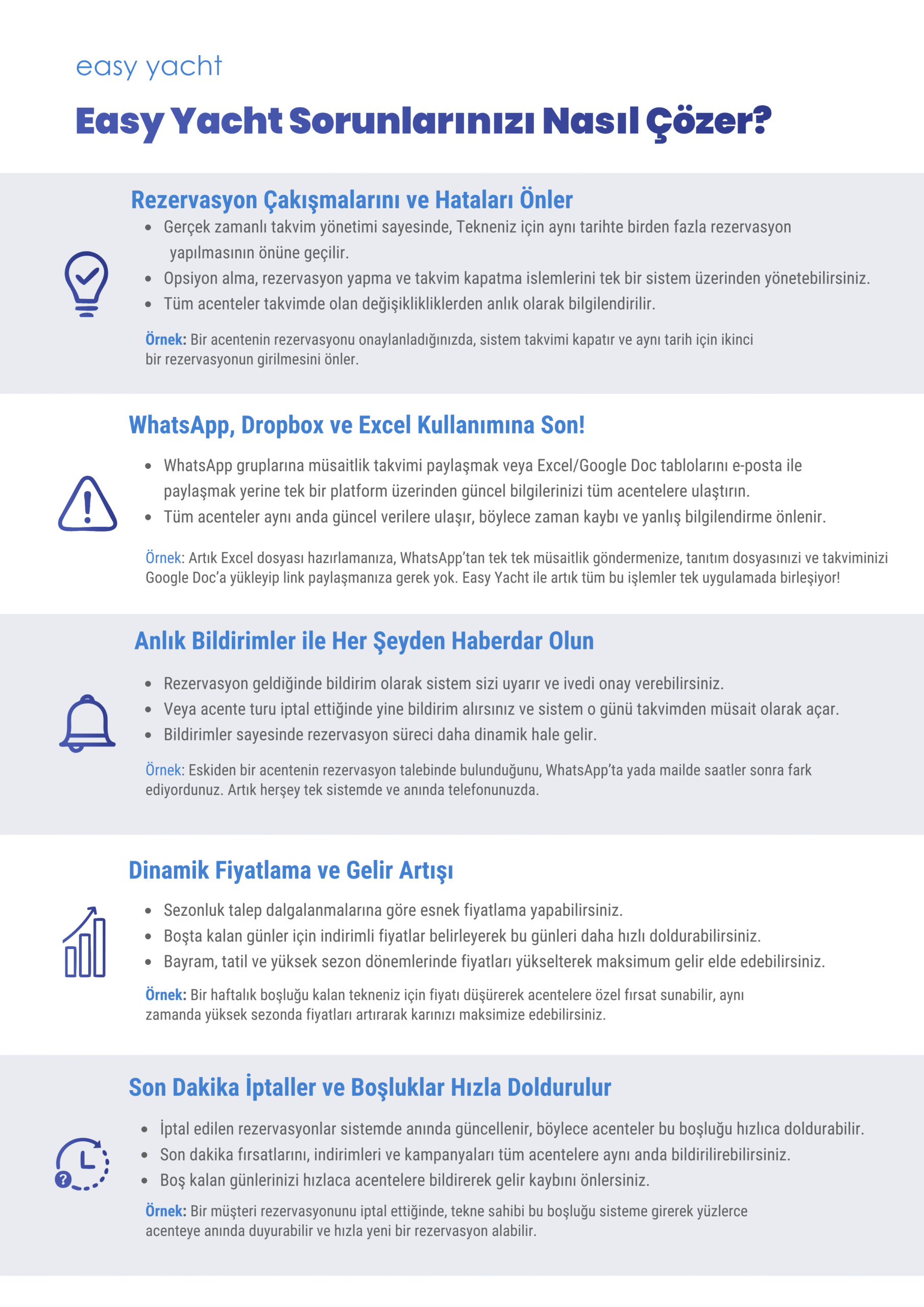 Ayrıca, rezervasyon çakışmalarını önleyerek, her yeni rezervasyonun otomatik olarak güncellenmesini sağlar. Esnek fiyatlandırma ve kampanya yönetimi ile sezonluk fiyatlar ve özel indirimleri hızla güncelleyebilir, teknenizin daha fazla kiralanmasını sağlayabilirsiniz.